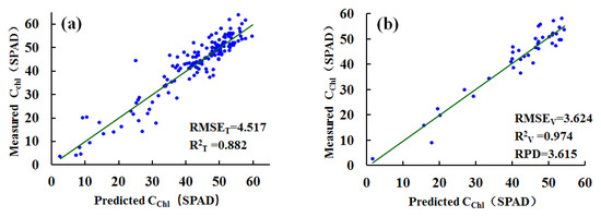 The estimated results of SPAD value for (a) training set and (b) validation set based on pretreatment WPD-R’-PCADR at mature stage.