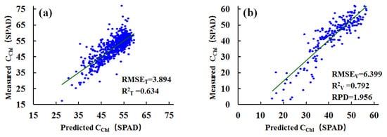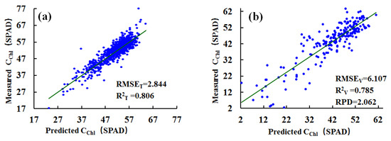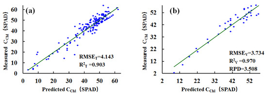 The estimated results of SPAD value for (a) training set and (b) validation set at whole growth stage.