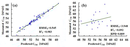 The estimated results of SPAD value for (a) training set and (b) validation set at mature stage.
