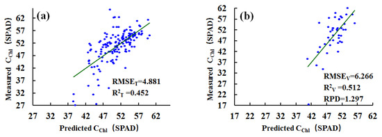 Secondly, using preprocessed spectral data or sensitive spectral indices set as the model input value can significantly boost the precision and stability of the PLSR-based SPAD value estimating model, and when the STDchl of all samples in the model sample set is greater than 5.5 (Table 1, Table 5 and Table 6), the estimation accuracy is higher (the estimation accuracy is greater than 0.5), and the model is stable (RPD is greater than 1.4). Moreover, when STDchl in the sample set is greater than 5.5, the larger the SPAD value in the sample set, the more accurate the model’s estimation. Most important of all, the STDchl in the sample set and the estimation accuracy of the model from high to low are the mature stage, whole growth stage, jointing stage and milk mature stage. It can be seen that the SPAD value estimation model based on PLSR is particularly responsive to the input sample set’s STDchl in addition to the high requirements for the spectral input value of the model (appropriate spectral data preprocessing or appropriate spectral indices set). In addition, there are great differences in the estimation results of single growth period data. If only the data of a single growth period are used to build a model to estimate the SPAD value, the universality of the estimation results is too weak. It is suggested to collect the data of mixed growth period (such as the whole growth period in this paper) for relevant estimation research, and the stability of the model is stronger.