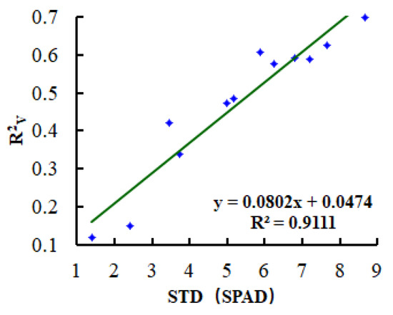 The research shows that when the SPAD value range in the sample set is small (50~55, 50~60), the standard deviation of the sample set is also small, and the corresponding model R2V value is also poor (R2V is less than 0.2). As the range of SPAD values in the sample set gradually increases, the standard deviation also increases, and the corresponding model estimation accuracy (R2V) basically shows a gradually increasing trend, and the more stable the model estimation result is (RPD). Figure 18 shows the variation law of RPD with the STDchl in the sample set, and Figure 19 shows the variation law of R2V with the STDchl in the sample set. It can be seen from the two figures that the STDchl in the sample set is highly correlated with the PLSR SPAD value estimation model’s accuracy and reliability. When the STDchl in the sample set is larger than 5.5, RPD is greater than 1.4 and R2V is higher than 0.5, the model is stable, and its accuracy is high. At this time, the PLSR model could be used to predict the SPAD value with high accuracy.