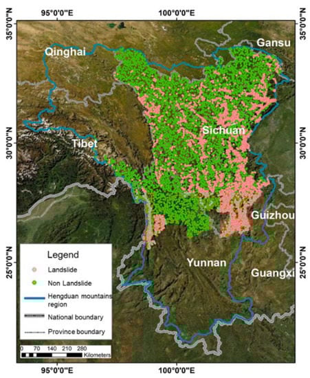 The Hengduan Mountains region is located in the southeastern part of the Qinghai–Tibetan Plateau and is a general term for the north–south-oriented parallel mountains in the western part of Sichuan and Yunnan provinces and the eastern part of the Tibet Autonomous Region, covering an area of more than 700,000 km2, with elevation ranging from 124 m to 7473 m (Figure 1). Actually, the Hengduan Mountains region is a complete geomorphological partition, in which different subregions have similarities in geomorphological forms, tectonic features, and geomorphological development processes [62]. The Hengduan Mountains region has been recognized as being highly susceptible to landslides because of frequent earthquakes, extreme precipitation, and intensifying human activities [15,39,59,63].
