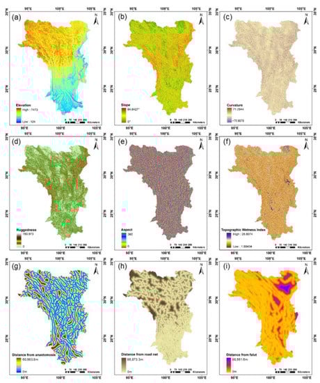 Static factors preselected: (a) elevation; (b) slope; (c) curvature; (d) terrain ruggedness index; (e) aspect; (f) topographic wetness index; (g) distance from anastomosis; (h) distance from road net; (i) distance from fault.