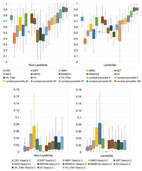 Dynamic factors included 33 explanatory variables (Table A1), and we analyzed the dynamic factors of the landslide and non-landslide sample points (Figure 5). Before further analysis, we normalized the dynamic factors considering the diversity of dynamic factors and remarkable value ranges of the dynamic factors. The quartiles of dynamic factors of the landslides are larger than those of the non-landslides, implying large differences in the eigenvalues of the samples throughout the study region. For Geary’s C spatial analysis, the values of both landslide and non-landslide factors mostly ranged from 0 to 0.1, which are much smaller than 0.5, indicating a strong spatial correlation of landslides and homogeneous features within the domain of landslides. Therefore, it is an ideal protocol for remote-sensing-based identification of landslide hazards in the Hengduan Mountains region.