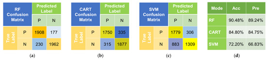 Assessment accuracy comparison and performance analysis of different models. (a) RF model; (b) CART model; (c) SVM model; (d) accuracy indices.