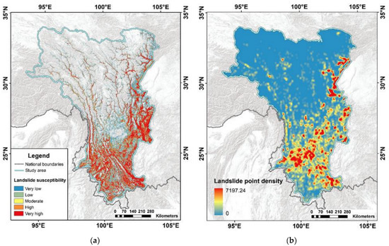 Landslide susceptibility assessment results and comparison with investigation landslide data. (a) Landslide susceptibility map; (b) landslide point density map based on the data of Resource and Environment Science and Data Center of the CAS.