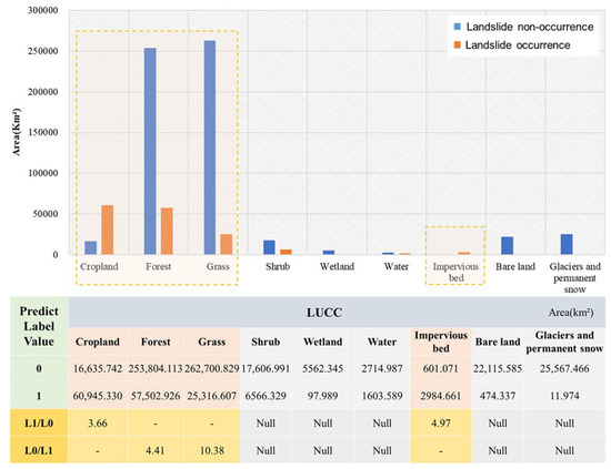 In high-latitude mountains, the stability of colluvial slope bodies is highly sensitive to external interferences or external forces, such as road construction, land reclamation, rainstorms, and so on. Different external forces may cause different degrees of instability of the colluvial slope bodies. In this case, we quantified percentages of landslide and non-landslide areas over regions with different land-use types. We found that non-landslide areas were 4.41 times and 10.38 times more than the landslide areas in the forest and grassland land types, respectively, while the landslide areas were 3.66 times and 4.97 times higher than the non-landslide areas in the cropland and impervious surface land types, respectively (Figure 11). These findings evidenced close relations between land use changes and LS in both space and time, illustrating a large spatial heterogeneity in LS variations that is highly influenced by forest cover types, cropland shifts, and settlement patterns [102,103,104].