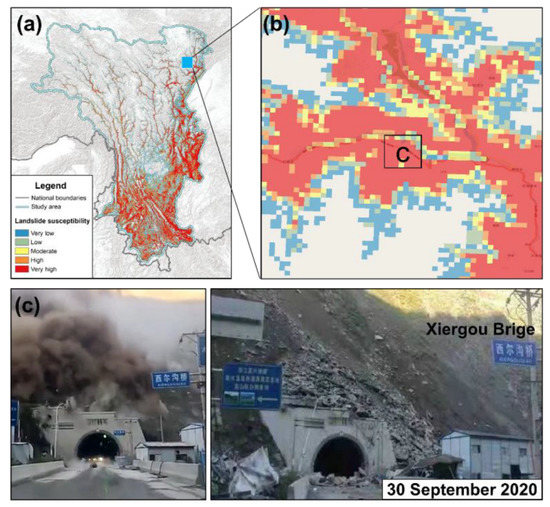 LS assessment results and comparison with landslide disaster information obtained from the Internet media. (a) is the LS map of the Hengduan Mountains region. (b) is the zoom-in view of LS map. (c) shows the scene when the landslide occurred.