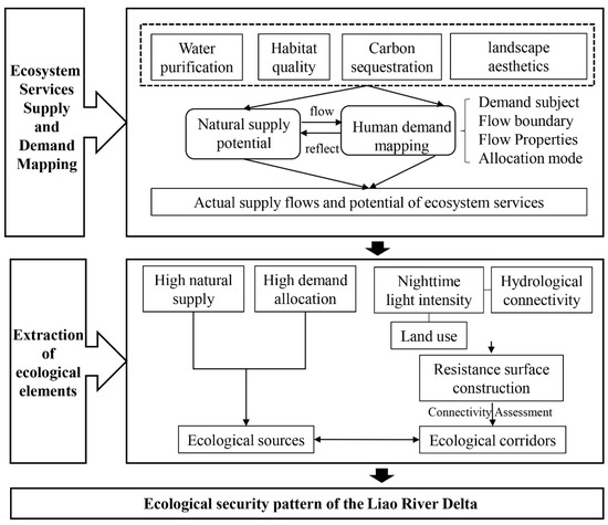 This study comprehensively considers the natural supply potential of the ecosystem and human needs and constructs an ecological security pattern with the characteristics of coastal wetlands to maintain the integrity of the ecosystem structure, function, and process. The service supply area and the service benefit area are connected by the method of spatial flow to identify the demand reflecting area and make up for the problem of remote coupling of supply and demand. This study proposes a new ESP framework in which various ecological elements can provide decision support on paths and locations for ecological management, safeguard the demand for natural products within the region, and maintain the natural potential for longer-term and wider-scale services. The frame is tried in the Liao River Delta. Based on understanding the processes by which multiple spatial streams of services transport and deliver ES, supply potential and service demand are quantified to identify ecological source sites consisting of high natural supply areas and high demand mapped areas. Based on the resistance surface corrected by hydrological connectivity and NLI, potential ecological corridors were extracted, and then network connectivity was optimized through connectivity evaluation. This study proposes ecological management logic and application according to the multi-level ESP and supply–demand relationship.