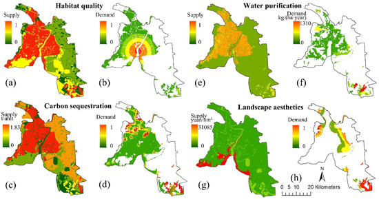 Natural supply potential and demand reflection of ecosystem services. (a), (c), (e) and (g) are the spatial distribution of natural supply capacity for habitat quality, carbon sequestration, water purification and landscape aesthetic services, respectively; (b), (d), (f) and (h) are reflections of the demand for habitat quality, carbon sequestration, water purification, and landscape aesthetic services in natural space, respectively.