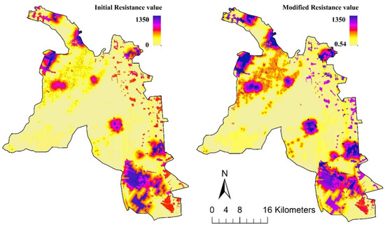 The spatial distribution of the initial resistance surface is shown in Figure 4, showing the characteristics of several large settlements in the north and southeast as the center of high values and slowly decreasing to the periphery. According to the related study, the values of NLI above 300.53 and below 0.24 were set to 300.53 and 0, respectively, to exclude the data singularity values. The high values of hydrological connectivity frequency were mainly located in the central and southern water systems, artificial water bodies, and flooding areas, which can provide a suitable living environment for birds, plankton, and benthic organisms. As shown in Figure 4, the resistance surface corrected by NLI and hydrological connectivity frequency improved in both global and local accuracy. Relatively, grids with higher hydrological connectivity frequencies have lower resistance values for the same level of human disturbance.