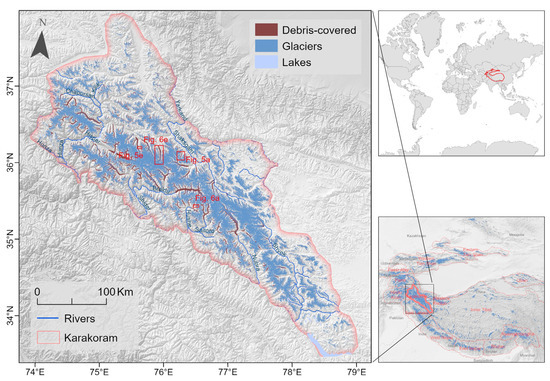 An overview of the Karakoram region. The inset in the lower left shows the location of the study area related to the glacier subregions in High-Mountain Asia.