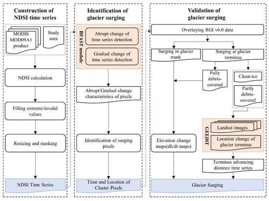 We propose the combination of the high temporal resolution of MODIS and the moderate spatial resolution of Landsat images to detect glacier surging and retrieve the associated characteristics (space, initiation date, duration period, terminus-advance length). The method (Figure 2) consists of three main sections: (1) the preprocessing of MODIS images to obtain pixel-by-pixel NDSI time series of the study glaciers; (2) the identification of glacier surging by detecting the trend changes of each NDSI time series with the BFAST module; (3) the validation and fine-featured determination of the glacier surging by referring to Landsat images and surface-elevation-change maps (dh/dt maps) [26].