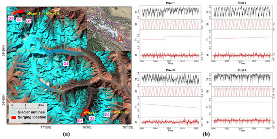 (a) Detection of grid clusters pertinent to glacier surging (red) and NDSI trend components at exemplified pixels. Pixel 1 and Pixel 2 represent two types of NDSI time series changes related to glacier surging. Pixel 3 and Pixel 4 are examples of nonsurging pixels around and within the glacier polygon. In (a), the background image is a false-color composite (band 6—SWIR1, 5—NIR, 4—Red as RGB) from Landsat 8 OLI acquired on 14 October 2020. (b) Glacier outlines are based on RGI v6.0. Results of the BFAST-decomposed components of surging and nonsurging pixels in the NDSI time series. In each plot, the four panels from top to bottom are the original NDSI time series of each pixel (Yt), seasonal component (St), trend component (Tt), and remainder component (et).