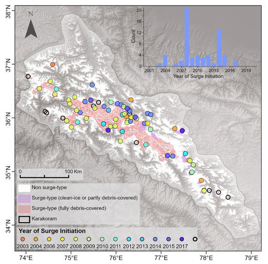 Our method detected 74 places of surging activities associated with 71 surge-type glaciers in the Karakoram from 2000 to 2020 (Figure 4). For some large glaciers, more than one occurrence of glacier surging was observed in different tributaries, termed as tributary glacier surges [70]. We identified tributary glacier surges on three glaciers (GLIMSId: G076483E35901N, G075281E36055N, and G075593E36006), which experienced surging at both the main termini and one of their tributaries. For example, the Hispar Glacier (GLIMSID: G075281E36055N) surged at its tributary, Kunyang, in 2008, followed by surging at the tongue terminus in 2015. The identified 71 surge-type glaciers are mostly concentrated in the central and southeastern parts of the study area (Figure 4), with the total area accounting for 34% of the glacier area in the region. Among the 74 surging events, 38 occurred on the clean-ice-covered or partly debris-covered glacier tongues, which showed significant terminus advance. We term this type as clean-ice glacier surging to differentiate it from the surging at heavily or fully debris-covered glaciers, and the former type of glacier surging can be directly retrieved from optical images. We detected 33 surge-type glaciers with heavy debris cover, mainly located in the central Karakoram. The surging at these heavily debris-covered glaciers could be successfully detected as parts of the upper glacier tongues shifted from debris-covered to snow/ice due to the substantial snow/ice transfer from the upper-reservoir areas. Statistics of the years of surge initiation (a rough estimation from the MODIS-based NDSI analysis) reveal the concentration of the surging initiation during 2008–2010 and 2013–2015 (the upper-right inset in Figure 4).