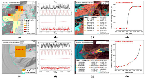 Examples of different types of surging on clean-ice glacier tongues. The GLIMS IDs for G8 and G9 are G076225E36119N and G075542E36235N, respectively. See Figure 1 for the locations of the two glaciers. (a,e) The locations and years of surge initiation; (b,f) the decomposed components of NDSI time series at the surge-affected pixel (red dots in (a,e)); (c,g) the change in the terminus position over time; (d,h) the time series of the terminus-advance distance. The background images are false-color composites (band 6—SWIR1, 5—NIR, 4—Red as RGB) from Landsat 8 OLI acquired in 2020 in (c,g).