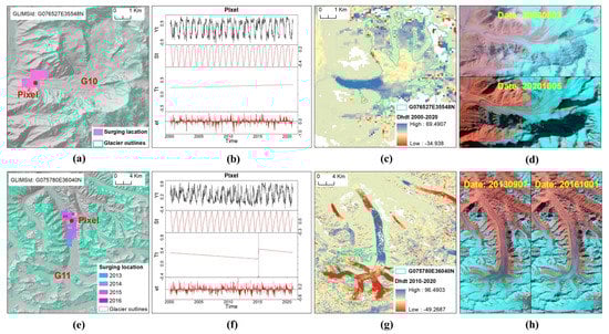 Examples of surging at fully debris-covered glacier tongues. The GLIMS IDs for G10 and G11 are G076527E35548N and G075780E36040N, respectively. See Figure 1 for the locations of the two glaciers. (a,e) The surging locations and years of surge initiation; (b,f) the decomposed components of the NDSI time series at the surge-affected pixel (red dots in (a,e)); (c,g) the elevation changes of glaciers G10 and G11; (d,h) the corresponding false-color composites (band 6—SWIR1, 5—NIR, 4—Red as RGB) of the Landsat imagery before and after surging.