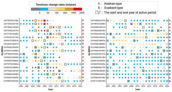 Temporal evolutions of glacier-terminus-change rates for the 38 clean-ice or partly debris-covered surge-type glaciers during 2000–2020. The start and end years of the active period are flagged with squares with solid black outlines. The black squares with dashed outlines indicate that the exact start year or end year of the active period is not discernible for some ongoing surging glaciers (particularly the Svalbard type). Measurements are absent for certain years due to the availability of free images with no obvious seasonal snow.