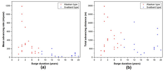 For the 38 surging events on clean-ice or partly debris-covered glaciers, we further determined the details, including the active periods/surge durations (defined as the start year when the terminus changes accelerate, and the end year when the terminus changes slow down), the total terminus-advancing distance, and the terminus-advancing rate (a proxy of the ice velocities) according to the time series of the terminus-position changes (e.g., Figure 5d,h). Here, to better differentiate the different styles of surging rather than the underlying mechanisms, we classified the surge-type glaciers into the traditional Alaskan type and Svalbard type, according to the features of the terminus changes over time (Figure 7). The start and end years of the active period are flagged with black squares for each glacier (Figure 7). Note that for some of the ongoing surging glaciers (particularly the Svalbard type), the start year or end year of the active period is not discernible from the time series of the terminus changes, and they are flagged with black dashed squares. The majority of the glaciers surging on clean-ice (or partly debris-covered) glacier tongues/termini (23 out of 38) can be categorized as the Alaskan type, and they experienced abrupt terminus advance during a short period (e.g., 1.8 km during 2009–2014, Figure 5c,d). We detected 15 examples of Svalbard-type surging, which exhibits gradual initiation or termination over a protracted period (over 10 years in our studied database). The Alaskan-type surging glaciers exhibited a mean active period of 5 years, with a mean advancing rate of 374.68 m/year (varying from 100 m/year to over 1000 m/year for different glaciers). In contrast, the Svalbard-type surging generally showed a much more prolonged advancing period (15 years on average) and a lower advancing rate (generally less than 100 m/year, 65.27 m/year on average) (Figure 8a). According to the enthalpy-balance theory, both the Alaskan-type and Svalbard-type surging events occur by the same mechanism. Our statistics on the relationship between the mean advancing rates and activation periods indicate that the two types generally follow the same power-law distribution, but at different spaces (Figure 8a), whereas the total advancing distances present no significant differences between the two types (Figure 8b).