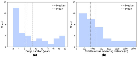 Distributions of (a) surge durations and (b) total terminus-advancing distances of the 38 clean-ice or partly debris-covered glacier-surging events.