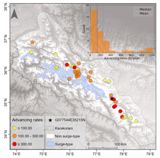 Spatial variation in the terminus–advancing rates of the 38 clean-ice or partly debris-covered glacier-surging events. The upper right inset shows the statistics of the terminus–advancing rates of the surge-type glaciers.