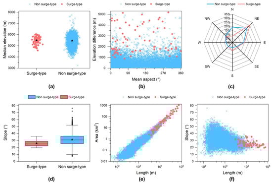 Geometry characteristics of surge-type and nonsurge-type glaciers in the study area: (a) distribution of median elevation; (b) scatterplot of elevation difference (the difference between maximum and minimum) versus mean aspect; (c) distribution of glacier aspects; (d) mean slope comparison; (e) scatterplot of area vs. length; (f) scatterplot of mean slope vs. length. Please note the logarithmic scale of the (e,f) x-axis and (e) y-axis.