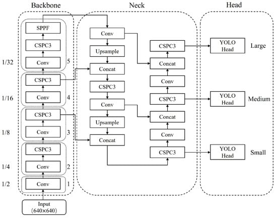 For a long time, the YOLO series of algorithms [,,,,,] have always pursued the best balance between accuracy and speed, and the method in this paper is an improvement based on YOLOv5 6.0 []. YOLOv5 provides a total of five model sizes of n, s, m, l, and x according to the different widths and depths of the network. As shown in Figure 1, the network architecture of YOLOv5 6.0 can be divided into three parts: backbone, neck, and head. The backbone is an optimized CSPDarknet that has five stages for feature extraction and generates five scale features, and then sends the C3, C4, and C5 feature maps output by the last three stages to the neck. The neck is the optimized PANet [], which has two branches for top-down and bottom-up multi-scale feature fusion. The head follows the coupled head of YOLOv3 [] and detects objects of large, medium, and small scales based on nine preset anchor boxes. The loss function of the algorithm is composed of BCE as classification loss and objectness loss, and CIoU [] as regression loss for bounding box prediction.