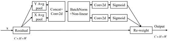The detection network usually adds attention mechanisms such as SE [] and CBAM [] to enhance performance. However, SE only considers the connection between internal channel information and ignores the importance of spatial information. At the same time, CBAM introduces the local pooling operation of spatial information to the channel, but it suffers from the inability to obtain a large range of dependent information. The proposed coordinate attention mechanism (CoordAtt) [] alleviates the above problems by embedding large-scale location information into channel attention. The structure of CoordAtt is shown in Figure 2 and consists of two main steps: coordinate information embedding and coordinate attention generation. In the first step, the input feature map X is first aggregated into two separate orientation-aware feature maps along the horizontal and vertical directions through two one-dimensional global pooling operations. In the second step, the two feature maps are first spliced with embedded specific orientation information, and then, a 1 × 1 convolution and sigmoid function is used to output an intermediate feature map encoded with horizontal and vertical spatial information. The intermediate feature map is then split into two separate vectors along the spatial dimension, the channels are raised to the same dimension as the input feature map through two 1 × 1 convolutions, and the attention maps are output by the sigmoid function as and . Each attention map captures long-range dependencies of input feature maps along one spatial direction, and location information can thus be preserved in the generated attention map. For example, Formula (1) calculates the weight of of the cth channel of the output: