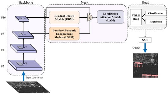 - A simple and efficient neck of the network is designed, discarding the complex feature pyramid network design. It mainly consists of three modules. One is a residual dilated module (RDM) that integrates the multi-scale receptive field. The second is a low-level semantic enhancement module (LSEM) that enhances the scattered information of SAR images. Furthermore, the third is a location attention module (LAM) that refines the multi-feature information after fusion.