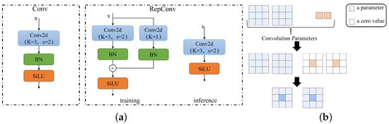 Before each stage of the backbone performs feature extraction, the input feature map is downsampled to reduce the computational load of the subsequent network. However, downsampling reduces the resolution and inevitably loses some detailed information, which is not conducive to positioning aircraft targets. As shown in Figure 4a, the basic Conv block is downsampled by convolution with kernel 3 and stride 2, followed by the BN layer and SiLU activation function to maintain better gradient transfer. To better retain feature information during downsampling, this paper introduces a structural re-parameterization technique of RepVGG [] to optimize the Conv block. The core idea of the structural re-parameterization technique is that the network realizes the equivalent conversion of the structure through the equivalent conversion of parameters. Specifically, a set of branches with a convolution kernel size of 1 are added to the original Conv block during model training. The RepConv block is formed to increase the diversity of downsampling, and the parameters of the added branch are fused into the Conv block using the re-parameterization technique during inference so that the structure of the inference is the same as that of the Conv block, which enhances the capability of the model without affecting the detection speed. Convolution in deep learning is a cross-correlation operation. Since this operation is linear, the parameters of the convolution kernel increase with additivity. Figure 4b shows the simplified RepConv re-parameterization process. During inference, firstly, the BN layer is just a simple linear mapping, and its parameters can be directly added to the convolution kernel to improve the inference speed. It can be assumed that the number of channels in the input feature map X is 1, and the number of channels after downsampling by RepConv is 2. Then, use and to represent the weight parameters of the 3 × 3 and 1 × 1 convolutional layers, respectively. For a 1 × 1 convolution kernel, it can be equated to a special 3 × 3 convolution kernel with only non-zero values at the center. So that the weights of the convolution layers of the two branches can be summed up by channels and the summed weights can be denoted as , this paper uses “*” to represent the convolution operation; then, this process can be represented by Formula (2):