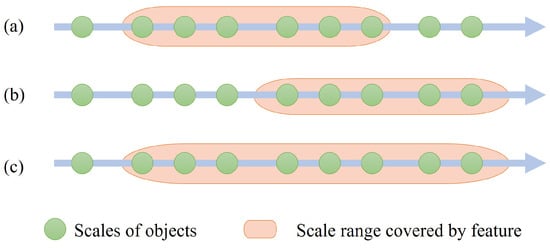 Considering that too much downsampling brings a larger receptive field, it also loses many details required for small target detection, and we hope to perform the detection task well on a feature map with only one resolution size; the dilated encoder approach [] is used to alleviate these problems. We use dilated convolution after the optimized backbone to increase the receptive field while maintaining the original feature map size. As shown in Figure 5, we use the Conv block to design a residual dilated module (RDM), which is formed by stacking two residual blocks with different expansion rates. The C4 feature map is the input to this module, which first enters the 1 × 1 convolution to reduce the channel dimension. Then, we use the dilated convolution to expand the receptive field, and we finally revert to the original channel number and fuse it with the input feature with the smaller receptive field. Figure 6 indicates the size of the aircraft targets covered by the receptive field in the feature map: (a) indicates that the receptive field of the C4 feature can cover most of the small- and medium-sized targets; (b) indicates the receptive field after dilated convolution can cover large- and medium-sized targets; and (c) indicates that the features of the two receptive fields can be fused to cover almost all target sizes through the RDM.