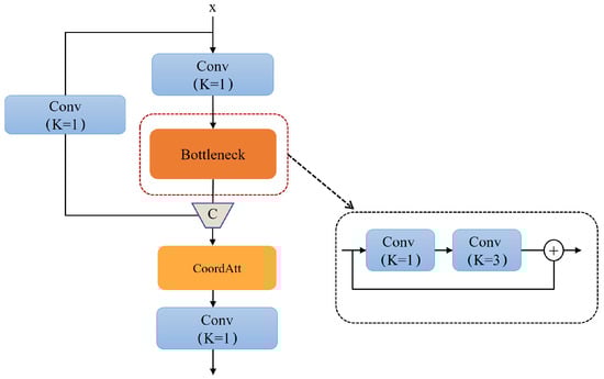 The fused feature map of the RDM and the LSEM already has enough information for aircraft target detection in complex environments. However, the feature information is redundant and easily confused due to surrounding objects. To this end, we design a localization attention module (LAM) to refine the fused feature map, hoping to achieve the effect that aircraft targets differ significantly from the surrounding features on different feature channels. As shown in Figure 8, the module first takes the fused output feature X as input through two branches. A branch first reduces the dimension of the input channel through a 1 × 1 Conv. It then refines the semantic features through a bottleneck block to perform a splicing operation with the other branch’s 1 × 1 Conv channel dimension-reduction feature. The bottleneck block is a residual block formed by stacking two Conv blocks. Then, the output features are enhanced with spatial localization information by CoordAtt. Finally, the channel dimension and the nonlinearity of the network are maintained by a Conv block. In this way, LAM refines the features, strengthens the target’s response on the feature map, and suppresses interference due to surrounding objects.