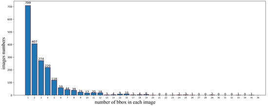The Gaofen-3 aircraft target dataset [,] in this paper has been collected by the Gaofen-3 satellite and consists of single-polarization SAR image with a resolution of 1 m in the C-band and includes multi-temporal phase maps of multiple airports. The dataset has a total of 2000 image slices, with image sizes ranging from 600 to 2048 pixels. It mainly includes seven types of civil aircraft, such as the Boeing 737, with a total of 6556 aircraft samples. Figure 9 shows from the histogram of the bounding box distribution that there is only one aircraft in many images, but at most there are 35 aircraft in a picture. Figure 10 shows a partial dataset slice, with the area marked by the green box the aircraft target. Furthermore, strong scattering points such as covered bridges and buildings are around the aircraft. By combining Figure 9, Figure 10 and Figure 11, it can be seen that the aircraft targets in this dataset have uneven image quality, significant differences in the sizes of aircraft targets, dense target arrangement, and complex surrounding ground objects. This paper randomly divides the dataset into training, validation, and test sets at a ratio of 6:2:2 for experiments.