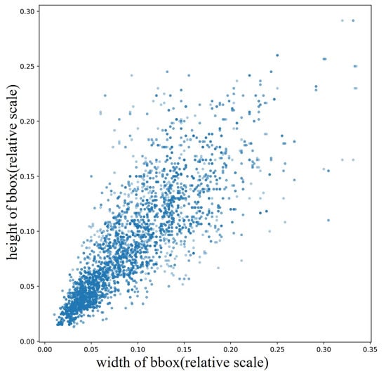 Since the method in this paper does not use FPN as the neck and only detects at one resolution of 16-times downsampling, if the original scale of the anchor box preset is used, anchor box recall on the dataset is low, and there are many missed detections. Therefore, it is necessary to redesign a set of anchor boxes based on the dataset’s labeling information to optimize the model’s performance. Figure 11 shows the aspect ratio of the aircraft bounding boxes relative to the images; it can be seen that the aspect ratio of the aircraft target is close to 1:1, and most of the aircraft are small relative to the image. From a relative scale perspective, a target is usually defined as small when the ratio of the target’s bounding box area to the image area is less than 0.58% []. Data analysis finds that small targets account for 48.8% of the SAR aircraft dataset. For this reason, we determine the bounding box size of the training samples by the K-means clustering method and finally find four groups of anchor-box presets suitable for aircraft samples: (16, 14), (27, 25), (52, 50), (90, 83).