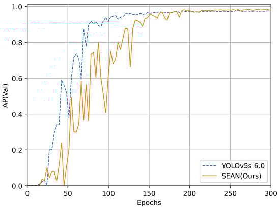 Training curves on the validation set. We evaluate the AP of each epoch for model training, and the results show that SEAN is better than YOLOv5s.