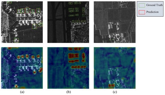 To better understand the points of interest of the SEAN model under complex ground conditions, this paper uses the Grad-CAM [] technique for visualization. This is a back-propagation gradient of the information from the predicted anchor boxes, and the learning of the model is represented by the response of the parameters of the last convolution layer using a heat map. In Figure 14a–c represent three cases of difficulty detecting due to complex ground objects, dense aircraft arrangement, and small aircraft targets. The actual detection effect of the model is in the upper half, and the corresponding Grad-CAM feature visualization is in the lower half. The figure shows that the model can accurately detect the aircraft targets in all these scenarios. Furthermore, the heat map shows that the areas with aircraft targets are red. In contrast, other objects such as corridors, buildings, and runways are presented in cool colors, which proves that our algorithm has strong anti-interference ability and high detection accuracy in complex scenes.