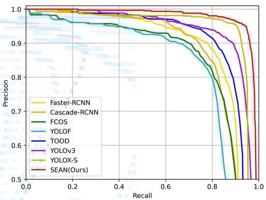 To further demonstrate the effectiveness of SEAN, we compare it to seven typical detection algorithms based on MMDetection []. As shown in Table 7, the long training time of relatively large backbone networks such as ResNet, especially two-stage algorithms, makes them prone to over-fitting on small-scale SAR data. Therefore, we use a pre-trained model for initialization in the backbone of these networks. In terms of detection speed, the table shows that models using ResNet50 as the backbone and FPN as the neck, such as Cascade R-CNN, have massive computational effort, resulting in significantly lower detection speeds. Moreover, detection speed is improved when YOLOF adopts the dilated encoder (D-en) as the neck. While YOLOv3, YOLOX-s, and SEAN (our method) all use a lightweight backbone, SEAN uses a simple neck to significantly improve detection speed. Regarding detection accuracy, YOLOv3, YOLOX-s, and SEAN (our method), which do not use ResNet50 as the backbone, are generally better than the other methods. As shown in Figure 15, the area of the PR curve of the SEAN algorithm is significantly larger than that of the other comparison algorithms, which means that the method in this paper has a significant detection accuracy advantage in actual detection. According to the above experiments, the proposed SEAN method has better average accuracy of 97.7%, a better F1 score of 94.9%, and faster detection speed of 83.3 FPS with fewer parameters and FLOPs than the typical algorithms on the SAR aircraft dataset.