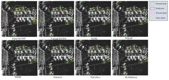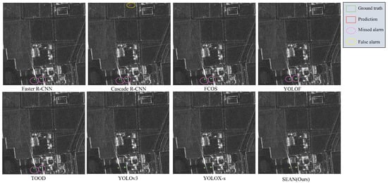 In order to visualize the effectiveness of SEAN, we select some challenging detection scenarios from the test set to compare the algorithms. Figure 16 shows a small target scene, and SEAN accurately detects the small aircraft target. Figure 17 and Figure 18 are two scenes with complex environments; SEAN has significantly fewer missed targets and false alarms compared to other models and can effectively avoid the influence of strong scattering points due to complex objects. Moreover, among the aircraft targets detected by SEAN, the bounding boxes completely wrap whole aircraft, and there are no situations in which only local components are detected.
