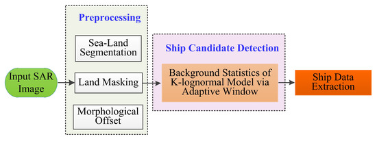 The conventional ship detection algorithms of single-channel SAR are proposed from the view of the ship targets off the coast, without considering the impacts of coastal regions [30]. In this section, a preprocessing step is performed, which is introduced to eliminate the effect of coastal regions before prescreening. The whole preprocessing is done in the SAR image domain, and mainly includes three aspects: sea-land segmentation, land masking, and morphological offset. After the preprocessing, the modified mixture distribution model, combined with an adaptive window and CFAR for ship candidate detection is analyzed in detail; the whole flowchart is illustrated in Figure 2.