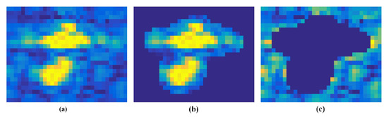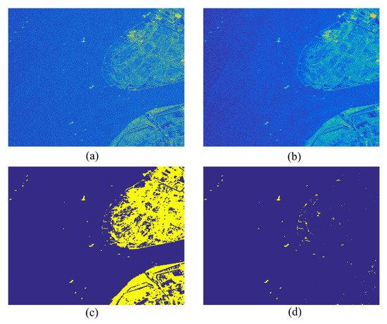 In order to implement sea–land segmentation, we firstly perform the mean filtering operation and amplitude normalization. We assume that a SAR image is illustrated by in the image domain as Figure 3a, and we binarize the input SAR image using the Otsu algorithm [30], which can adaptively divide the image into two parts: one is the background (sea surface) and the other contains the bright targets (land and ship targets), shown in Figure 3c. After the binarization, the image can be rewritten as