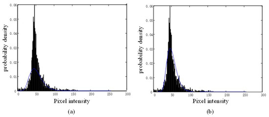 First, from the comparison of fitting results in Figure 5, it is obvious that the mixed distribution model in Figure 5b can accurately fit the distribution characteristics of the target to be detected and its surrounding background, compared with the single K distribution model. It should be noted that the view number of the image in Figure 5a is 2. According to the mean and variance of the target to be detected and the background in Figure 4a, the graphical parameter v = 3.32 of the k distribution parameter is obtained using formula (5), and then the k distribution curve is fitted. For Figure 5b, according to the mean and variance of the target background (c) to be detected, the shape parameter v = 2.18 is calculated using formula (5). According to the ratio of the number of target pixels to be detected in Figure 4b to the number of target background pixels to be detected in Figure 4c and , and = 0.58 can be obtained, and then the mixed model distribution can be easily fitted.