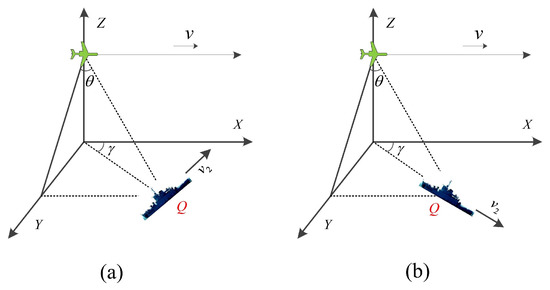 It is not difficult to find that the residual skew distance has a certain influence on the envelope and phase, and that the sensitivity of phase to error is significantly higher than that of the envelope. According to formula (12), the primary term of the residual oblique distance affects the azimuth focus position, which will change the focus position of the final target, and this part is mainly caused by the radial motion speed of the ship, while the high-order term determines the image focus quality. If the target to be detected has radial motion velocity, it can be determined that the detection target is a ship target. However, if there is no radial motion velocity of the target to be detected, it does not mean that the target to be detected is a pseudo target. We analyze the ship motion characteristics of short synthetic aperture time under the mobile platform. In Figure 7a, the ship moves perpendicular to the radar beam direction. At this time, there is no radial motion velocity in the residual oblique distance. In Figure 7b, if the ship moves along the radar beam direction, there is no rotational motion component of the ship in the residual oblique distance. Therefore, the problem of ship target precise detection can be transformed into the determination of the first-order term and a high-order term of phase in the target to be detected; that is, to judge whether the moving target to be detected has radial motion speed and its own rotational characteristics, and then to determine whether it is a real ship target.