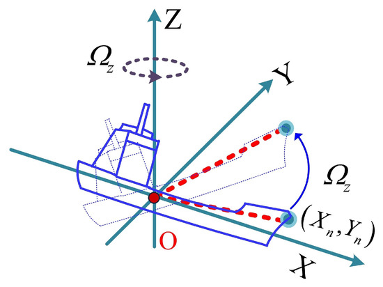 where represents the coefficients containing only the carrier motion and not the ship motion, in which this part is compensated in SAR focusing imaging; is each coefficient including ship motion, and this part of the component is unknown. After the SAR image is focused, for the center point of the ship, the residual oblique distance caused by the ship’s own motion is