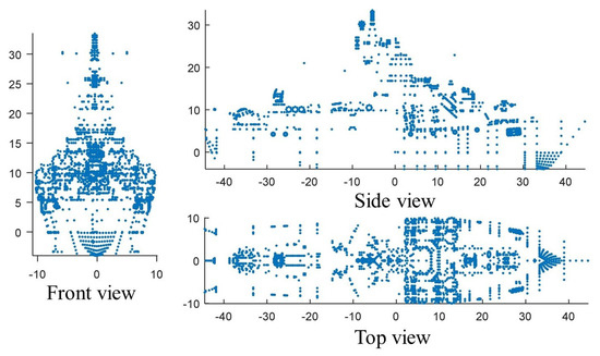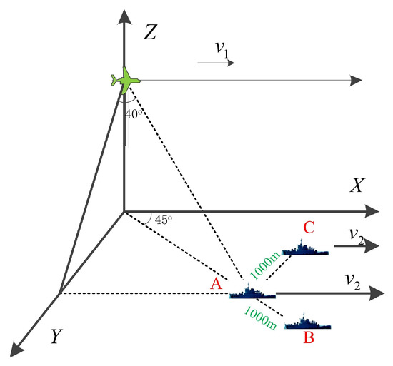 The simulation geometric model is shown in Figure 9. There are three ship targets in the scene, and the ship model is shown in Figure 10. The motion parameters of the mobile platform are shown in Table 1, and the ship motion parameters are shown in Table 2. In the simulation scene, a ship target is placed at the center of the beam. In addition, one ship target is placed along and perpendicular to the radar line of sight, with an interval of 1 km; B and C move at a speed of 10 m/s along the route, while A swings in place. In the echo data at this time, A and C exist in the same distance unit and cannot be separated.