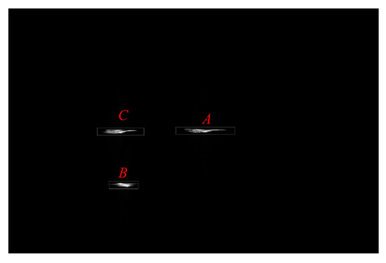 Figure 11 shows the image of the SAR coarse focus, in which the ship targets A and C cannot be separated from the data domain on the same range unit, and can be separated in the image domain after coarse focus. Since ship target A has no speed, its final focus position is located at the azimuth center, while for ships B and C, their radial speeds make them deviate from the azimuth center. After ship detection, the ship target is accurately separated, as shown in the rectangular window in Figure 11. The separated ship targets can be obtained by returning the detection results to the original SAR image, as shown in Figure 12. It is easy to see that the ship target after SAR coarse focus processing has poor imaging results due to the motion component of the ship itself, which cannot meet the imaging requirements. Further ISAR precise focus imaging is needed.