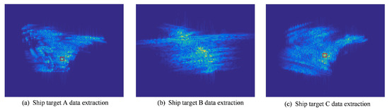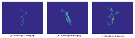 Next, ISAR imaging is performed on the separated individual targets, and the results are shown in Figure 14. It can be seen that after ISAR imaging, the imaging results of each target are clearer, and the structure of the ship target can be distinguished. In addition, due to the complex sway of the ship target, the imaging plane of each ISAR image is different, which leads to different observation angles of each ISAR image to the ship target; furthermore, due to the difference in the rotating speed of each target relative to the line of sight of the radar, the ISAR imaging result and size are both different.