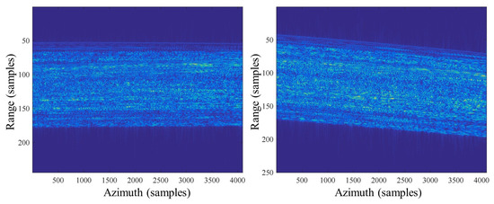 where is a constant. This residual oblique distance seriously affects the focusing of the ship center point, and there are space–variance characteristics due to the inconsistency of the residual oblique distance at each position of the ship. In order to further analyze the influence of residual skew distance, the echo signal in the range frequency domain and the azimuth time domain after range compression can be expressed as (its window function form is ignored here)