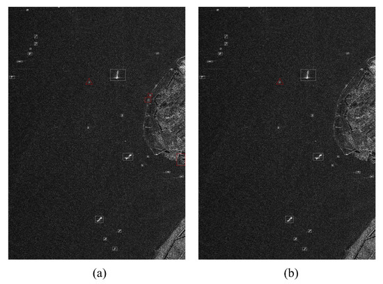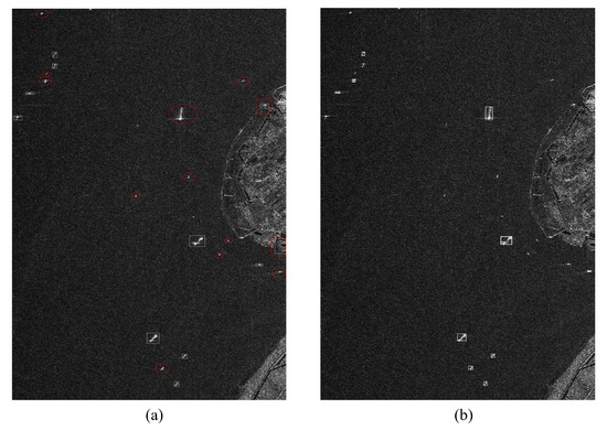In order to verify the effectiveness of the proposed algorithm, the field data of a certain spaceborne SAR (the field data in the preprocessing of this article) is used. Figure 15 shows the detection results of a spaceborne SAR ship using the reference detection algorithm in [37]. The reference algorithm in [37] only uses a single K distribution for detection. It can be seen that the use of a single distribution model will cause most ship targets to miss alarms, as shown by the elliptical dashed line in the figure. In addition, because the reference algorithm does not have a precise detection algorithm, there is a certain false alarm in the final detection result, as shown by the rectangular dashed box in Figure 15a. Moreover, we also use a deep learning network for ship target detection. The detected network is YOLOx, and the training data adopts the SSDD data and HRSID data; the detection results are shown in Figure 15b. It can be seen from Figure 15b that some small ships are not detected. Therefore, the detection accuracy of the ship detection method based on deep learning is relatively low, and the alarm leakage rate is high. This is mainly because the deep learning method may be greatly affected by the size of the ship target.