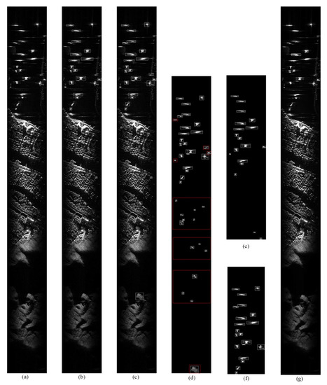 Comparison of detection results between the reference algorithm and proposed algorithm. (a) SAR focus image to be detected; (b) Reference algorithm detection results; (c) The rough detection results of the proposed algorithm; (d) Extraction of rough detection results of the proposed algorithm; (e) Reference algorithm detection result extraction; (f) Extraction of precise detection results using the proposed algorithm; (g) Results based on deep learning network.