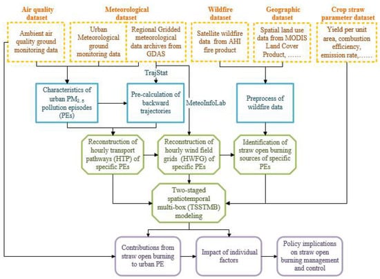 This study constructs a GIS-based integrated method including multiple techniques and models with collaborative multi-source datasets to quantify the contribution of external SOB sources to the elevated urban PM2.5 concentrations during specific haze episodes. The integrated model offers the possibility to link the spatial scope of external SOB sources, their transport pathways, and the pollution level of the receptor city at a high temporal resolution (1 h). Taking Jilin Province as the study area, and its capital Changchun as the pollution receptor city, SOB in province-wide farmland is examined, and its contribution to specific urban haze episodes during the SOB season of 2020–2021 is assessed quantitatively. Moreover, the impact of the area of SOB sources, their transport distance, average planetary boundary layer height (PBLH) along the transport pathway, urban PBLH, and urban wind speed are explored. The results will be beneficial to policymakers in developing refined management regulations on SOB to protect the atmospheric environment and to ensure agricultural production as well.